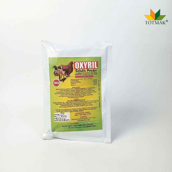 Oxyril is a combination of broad-spectrum antibiotics, essential vitamins, and antipyretic agents. It treats infections, reduces fever, and supports recovery in livestock and poultry, enhancing immune function and overall productivity.